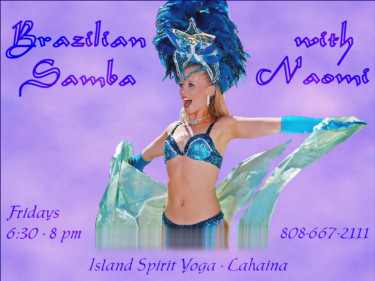 Brazilian Samba Flyer #1 : May 2005 The original photograph was provided, the subject was removed from the background and manipulated. A new background was created digitally. The yoga studio's logo was adapted for the document. Several font samples were provided. Once a font was chosen 3 page layouts were provided for final approval. The finished design was provided for full page and 1/4 page layouts. |